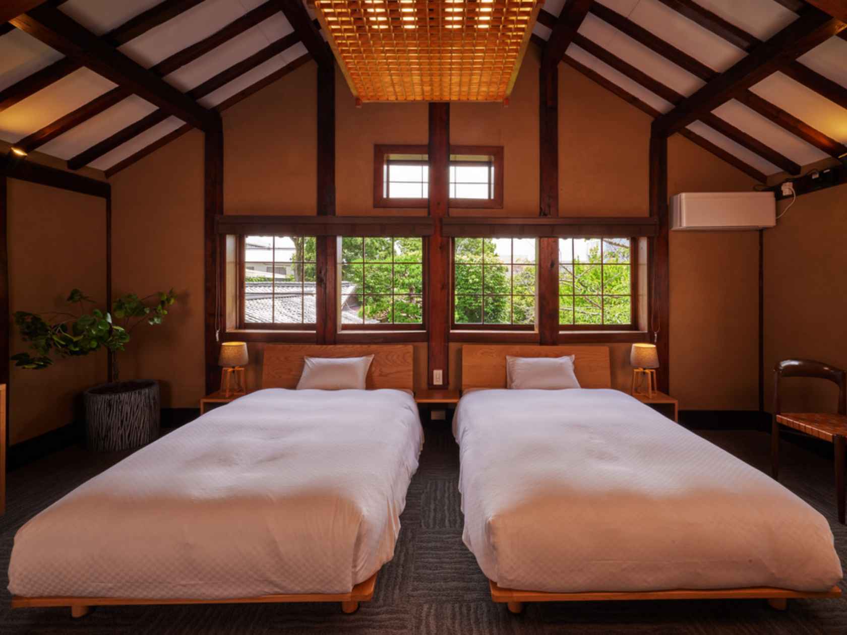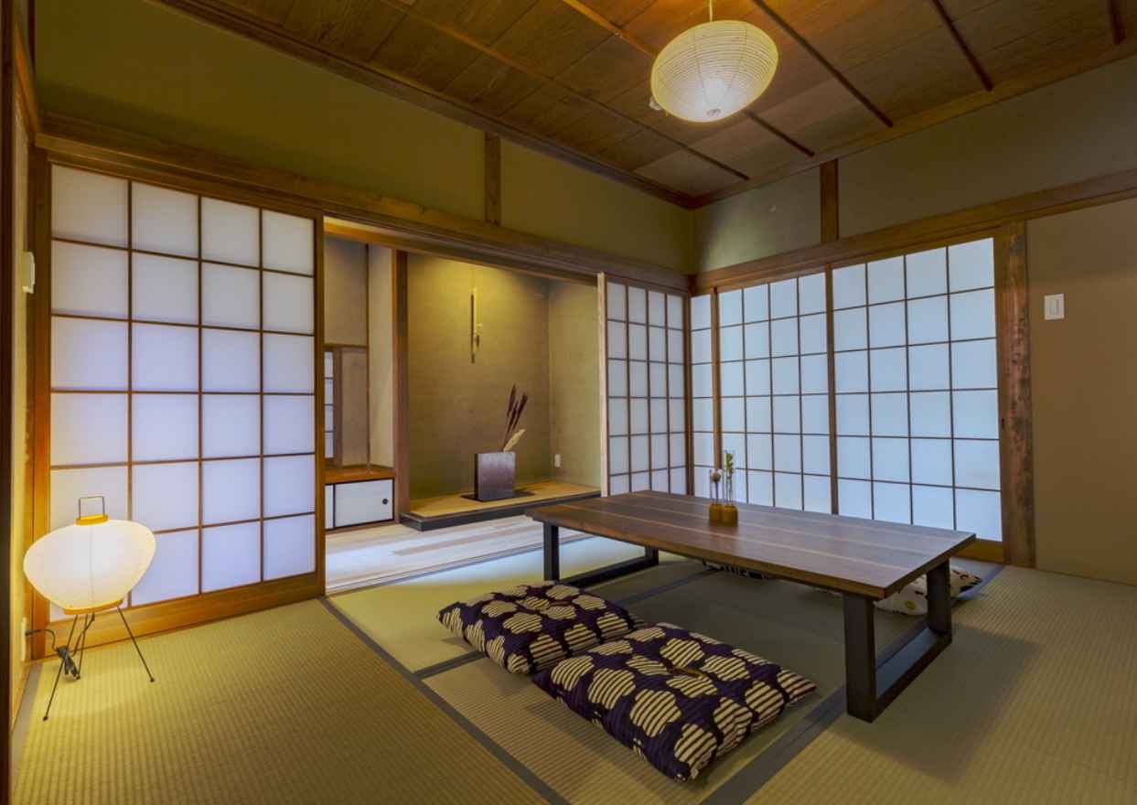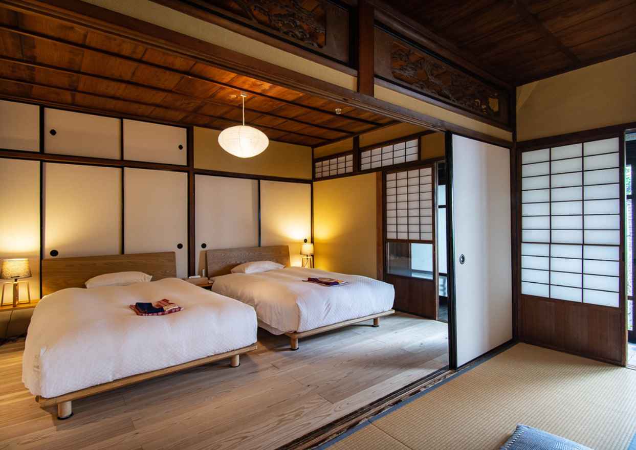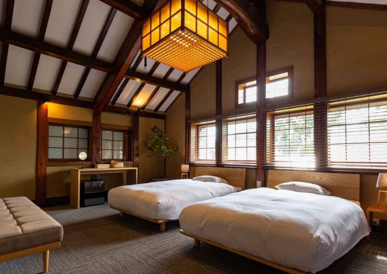 邸宅の高い天井やむき出しの梁、日本家屋の床の間や欄間など、それぞれの空間がもつ趣を存分に活かした全8室のホテル。